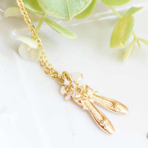 【サイズ】バレエシューズ:縦2、横1.2cmネックレス長さ40cm 【素材】金具:メッキ石:チェコガラス 【デザイナーからのコメント】 蝶々結びが可愛いバレエシューズの金色チャームに忘草のお花を添えて優しい雰囲気に・・♪