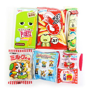 100袋以上の大量注文も承ります!! ※お菓子内容例:かっぱえびせん 12g、うまい棒、プリッツ〈マイルドサラダ〉 23g、ミルクボーロ 12g、コアラのマーチ 1パック、あべっ子ラムネ、いちご大福 ※袋のサイズ:190mm×290mm ※袋は画像にある種類のいずれかになります。